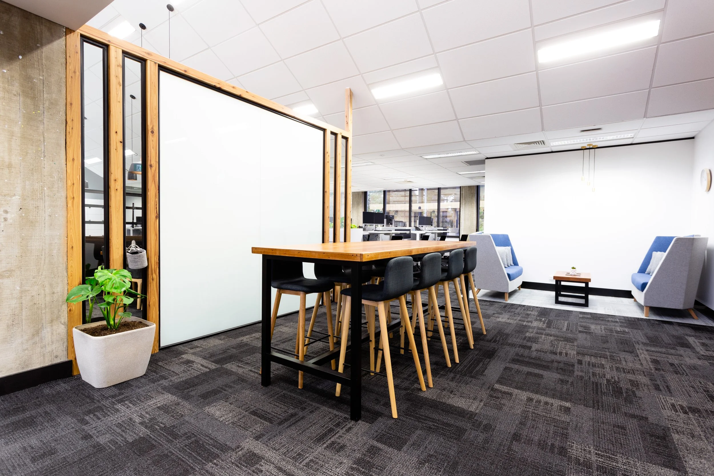 A standout feature of this project was the design of breakout spaces, which were carefully integrated to serve as collaborative meeting rooms when not in use as lunch areas. These open-plan spaces were designed to foster interaction, equipped with writable boards, comfortable seating, and ample space for impromptu meetings, providing staff with a place to gather, collaborate, and innovate over coffee.